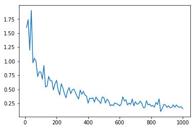 1 2 3 4 5 6 7 8 9 10 11 12 13 14 15 16 17 18 19 20 21 22 23 | net = SiameseNetwork().cuda() criterion = ContrastiveLoss() optimizer = optim.Adam(net.parameters(),lr = 0.0005 ) counter = [] loss_history = [] iteration_number= 0 for epoch in range(0,Config.train_number_epochs): for i, data in enumerate(train_dataloader,0): img0, img1 , label = data img0, img1 , label = Variable(img0).cuda(), Variable(img1).cuda() , Variable(label).cuda() output1,output2 = net(img0,img1) optimizer.zero_grad() loss_contrastive = criterion(output1,output2,label) loss_contrastive.backward() optimizer.step() if i %10 == 0 : print("Epoch number {}\n Current loss {}\n".format(epoch,loss_contrastive.data[0])) iteration_number =10 counter.append(iteration_number) loss_history.append(loss_contrastive.data[0]) show_plot(counter,loss_history) |
